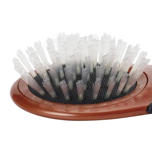 猫の細くてやわらかい被毛を無理なくとかすソフトなナイロンピン。段カット植毛で被毛の奥まで届きやすい。密に埋め込まれたブラシが被毛にまんべんなく入り込み、毛と地肌についた汚れや細かいフケをかき出し取り除く。猫の体の丸みや細部に合わせてブラッシングしやすい手にフィットするブラシ形状。