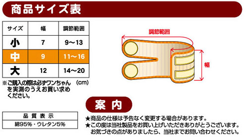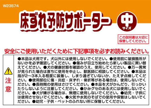 | 使用方法 | 1、床ずれになりそうな間接部分等にサイズを調節してください。 ※傷・炎症・床ずれ・骨折等がある場合は、使用しないでください。 2、二股に分かれている生地を引っぱり、面ファスナーでしっかりと留めてください。 ※指が2〜3本入る程度が目安です。 ※ワンちゃんの毛を巻き込まないように注意してください。 ※しまり過ぎていないか、たえず点検してください。 | 使用上の注意 | ●本品は犬用です。犬以外には使用しないでください。 ●使用前に破損箇所がないかを必ず確認してください。 ●傷みが目立ち始めたら新しい製品に買い替えてください。 ●犬の健康状態を確認のうえ、使用してください。 ●万一異常が見られた場合は直ちに使用を中止し、獣医師に相談してください。 ●本品は指が2〜3本入る程度に装着し、しまり過ぎていないか、たえず点検してください。 ●使用部位に傷・炎症・床ずれ・骨折等がある場合は、使用しないでください。 ●長時間の使用はさけてください。 ●本品を犬がかんだり、引っかいたりしないように注意してください。 ●かみグセのある犬には使用しないでください。 ●犬が嫌がる場合は、無理に使用しないでください。 ●幼児・子供には使用させないでください。 ●火気や水気のそばでの使用や保管はしないでください。 ●幼児・子供・ペットのふれない所に保管してください。 |