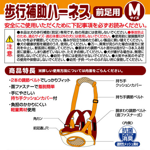 前足の筋力や視力が低下したときの歩行補助に。2本の調節ベルトでしっかりフィット。面ファスナーで着脱簡単。手にやさしい持ち手クッションカバー付。負担のかかりにくい軽量素材。抗菌・アンモニア消臭の通気性メッシュ素材使用(内側)