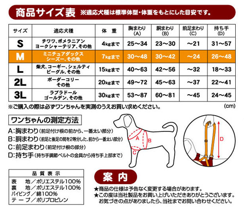 | 商品サイズ | <胸まわり>30〜48cm<br> <胴まわり>30〜42cm <前足まわり>〜24cm <持ち手の長さ>26〜48cm</td> |