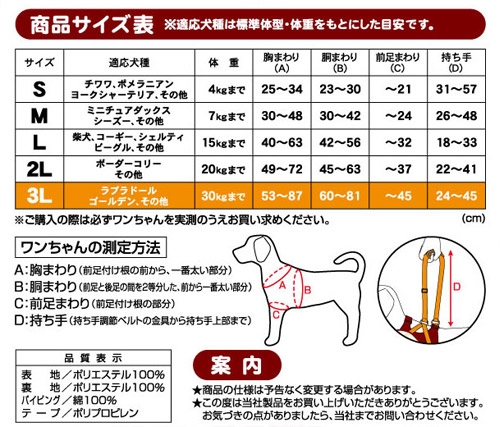 | 使用方法 | <装着方法> 1、持ち手調節ベルトと胴まわり調節ベルト(長い方)を前方に置いた状態で、前足通し穴に前足を通します。 2、胴まわり調節ベルトをそれぞれ角カンに通し、しまり過ぎない程度に面ファスナーで留めます。 ※指が2〜3本入る程度が目安です。 ※ワンちゃんの毛を巻き込まないように注意してください。 3、前方にある持ち手調節ベルトが背中側へいくように、ワンちゃんの頭を通します。 4、装着が完了したら、持ち手調節ベルトの長さを調節してください。 <正しい使い方> check1、ワンちゃんの背中の位置から真上に引き上げてください。 check2、ワンちゃんの横に立った状態で、地面とワンちゃんの背骨のラインとが必ず平行になる高さを保つように持ち手調節ベルトを調節してください。 check3、ケガ防止のため、引きずらないように注意してください。 ※ワンちゃんの歩行速度に合わせて進み、無理に引き過ぎないように注意してください。 |