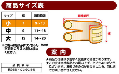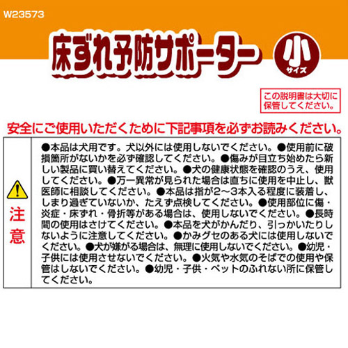 | 使用方法 | 1、床ずれになりそうな間接部分等にサイズを調節してください。 ※傷・炎症・床ずれ・骨折等がある場合は、使用しないでください。 2、二股に分かれている生地を引っぱり、面ファスナーでしっかりと留めてください。 ※指が2〜3本入る程度が目安です。 ※ワンちゃんの毛を巻き込まないように注意してください。 ※しまり過ぎていないか、たえず点検してください。 | 使用上の注意 | ●本品は犬用です。犬以外には使用しないでください。 ●使用前に破損箇所がないかを必ず確認してください。 ●傷みが目立ち始めたら新しい製品に買い替えてください。 ●犬の健康状態を確認のうえ、使用してください。 ●万一異常が見られた場合は直ちに使用を中止し、獣医師に相談してください。 ●本品は指が2〜3本入る程度に装着し、しまり過ぎていないか、たえず点検してください。 ●使用部位に傷・炎症・床ずれ・骨折等がある場合は、使用しないでください。 ●長時間の使用はさけてください。 ●本品を犬がかんだり、引っかいたりしないように注意してください。 ●かみグセのある犬には使用しないでください。 ●犬が嫌がる場合は、無理に使用しないでください。 ●幼児・子供には使用させないでください。 ●火気や水気のそばでの使用や保管はしないでください。 ●幼児・子供・ペットのふれない所に保管してください。 |