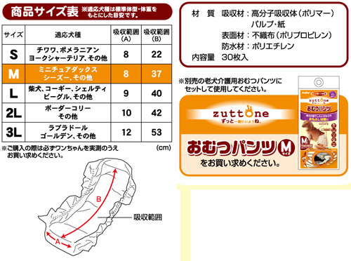 | 使用上の注意 | ●本品は犬のおむつパッドです。他の用途には使用しないでください。 ●必ず専用のおむつパンツ(別売)にセットして使用してください。 ●火気のそばでの使用や保管はしないでください。 ●事故等の恐れがありますので、裏面のテープカバーをはがした後は、すみやかに処分してください。 ●粘着テープが付いている面を下にして使用してください。 ●中の吸収体がモレますのでハサミ等で切らないでください。 ●犬が食べないように注意してください。 ●幼児・子供には使用させないでください。 ●水洗トイレには捨てないでください。 ●幼児・子供・ペットのふれない所に保管してください。 |