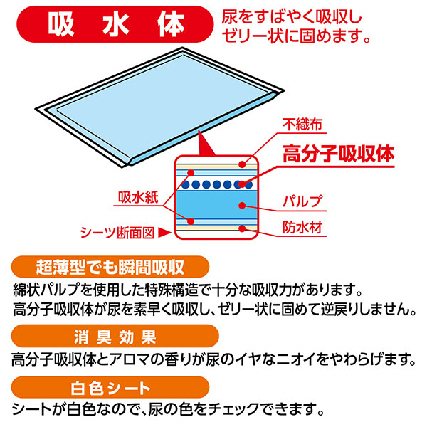 超薄型でも瞬間吸収、アロマが香るシーツ。綿状パルプと高分子吸収体(ポリマー)が尿をすばやく吸収し、ポリマーが尿のイヤなニオイを閉じ込めます。白色シートなので尿の色をチェックできます。