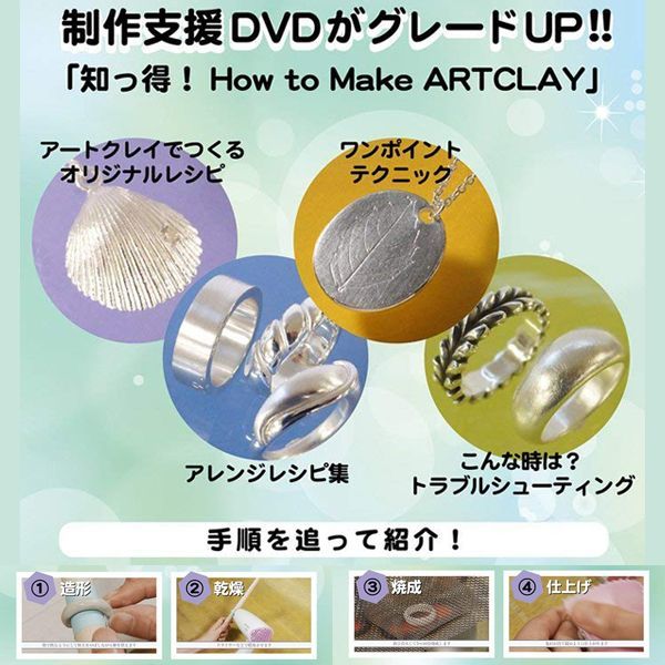 【セット内容】 ■アートクレイシルバー650 (10g)■制作支援DVD(本編約60分) ■制作レシピ ■リングサイズスケール ■ピンセット ■ステンレスブラシ ■ヤスリ(中目) ■木芯棒 ■ガスコンロ焼成用網 ■焼成カバー ■磨きヘラ ■スポンジ研磨材(赤#320?#600・青#800? #1000・緑#1200?#1500) ■いぶし液 ■シルバーポリッシュクロス