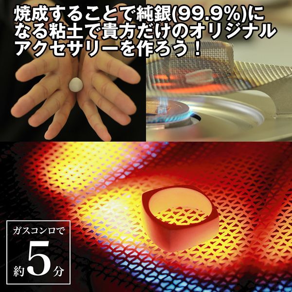 自由にカタチ作れ、焼くと純銀に変わる。家庭でアクセサリー作りを手軽に楽しめる画期的素材です。