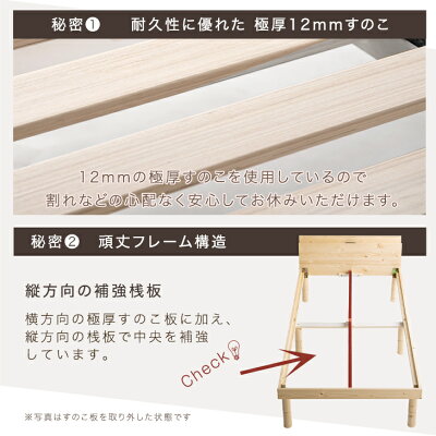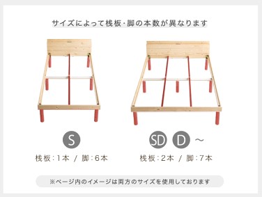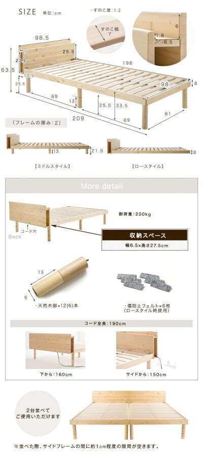 | 【ベッド:組立品】 ※配送は全て宅配便(1人)での玄関渡しとなります。大型商品や重量商品、エレベーターの無い2階以上にお住まいのお客様は、玄関口までの搬入のお手伝いをお願いしております事をご了承ください。 ※すのこの上に立つ場合はさん木の上に足をかけるなど強度の弱い部分に体重がかからないようにご注意ください。 ※ロースタイルでの使用時は、床傷が付く恐れがあるため中央裏面の連結金具は付けないでください。 ※商品の寸法はロット・測り方によって、ご使用に差し支えのない程度の多少の誤差が生じる場合がございます。予めご了承下さい。 ※すのこに黒っぽい斑点が多少ありますが、小さな節やマツヤニによる染みなどの場合がございます。使用上問題はございませんので、予めご了承ください。 ※すのこに青っぽい染みのようなものがある場合がございますが、松系統に良く見られるものであり、カビではございません。人体・強度に影響はございませんので、予めご了承ください。 ※天然木特有の臭いがある場合がございます。臭いが気になる場合は、開封時・組立時に換気を行なってください。 ※天然木を使用しておりますので、木目や色目により多少の色ムラがある場合がございます。予めご了承ください。 ※強度を維持する為にすのこに反り加工を施しております。湿度の関係でそりが強くなる場合がございますが、使用上問題はございませんので、予めご了承ください。 ※2019年6月26日よりすのこの厚みを18mmから12mmに変更し、それに伴い重量が5kg軽量化しました。同時により耐久性の高いLVBに変更したため耐久性には変わりありません ※2020年4月2日よりベッドのサイズを一部変更いたしました。追加でご購入される場合には予めご了承ください。 |