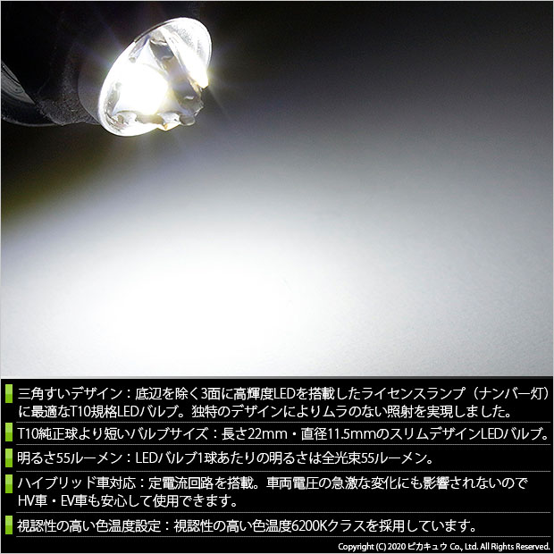 | ムラのない照射を実現 | 三角すい(ピラミッド型)基板の底面を除く3面に高輝度LEDを搭載したライセンスランプ(ナンバー灯)に最適なLEDバルブです。 | |||