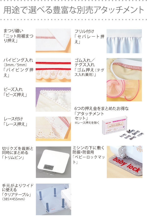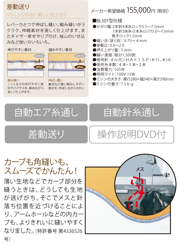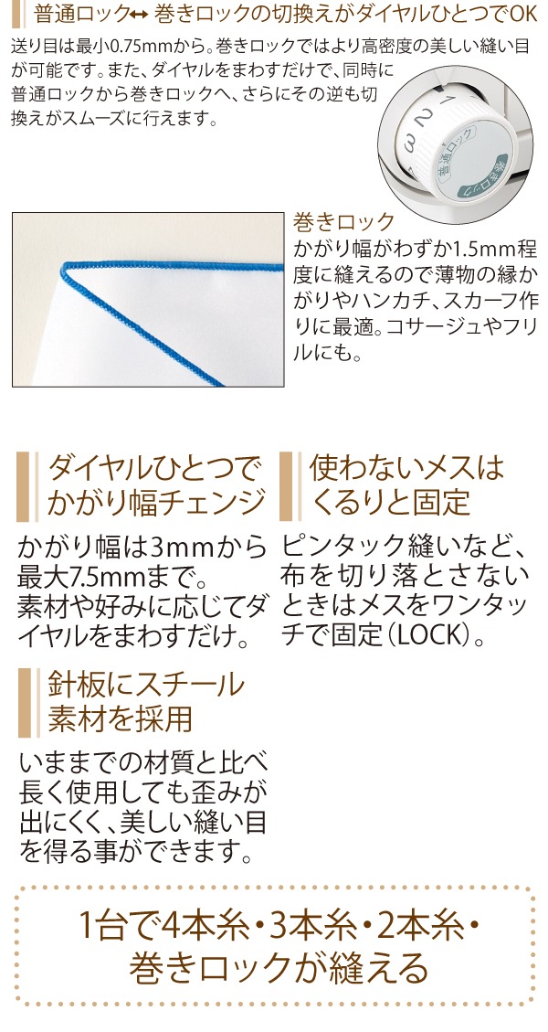 自動エア糸通し、自動針糸通し、差動送り、巻きロック切り替えダイヤル、手元LEDライト、かがり幅チェンジダイヤル、カーブも角縫いもスムーズ、新型上ルーパー、使わないメスはぐるりと固定、豊富な縫いバリエーション(2、3、4本糸縁かがり、巻きロック、4本糸縫い合わせ、巻きロック縫い合わせ、ニットファブリック付け、ギャザー寄せ、ピンタック、袖山のいせ込み、2本糸飾りステッチ、肩テープ入れ)