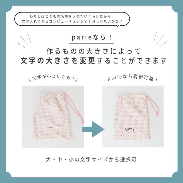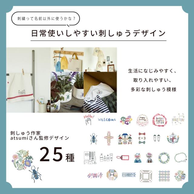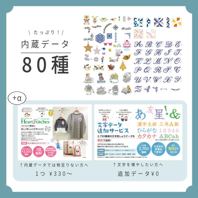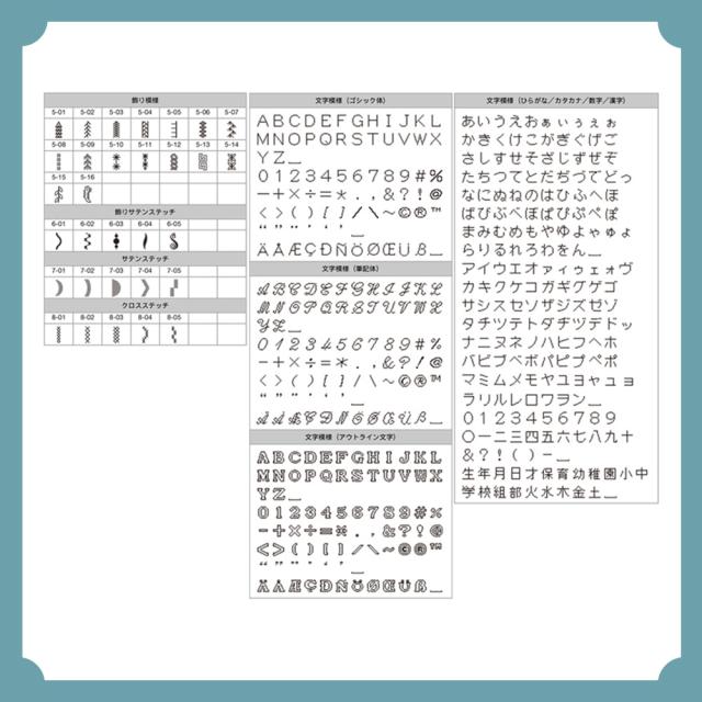 ※刺しゅう模様(クラフト刺しゅう80種、アルファベット7書体、かな3書体)