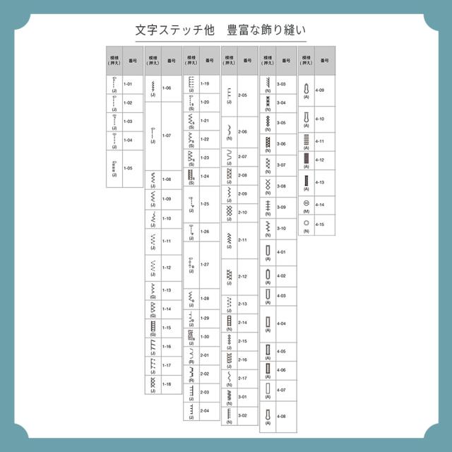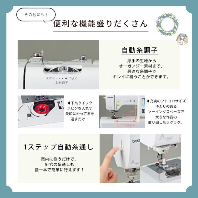 ■ミシン機能(ティーチング機能、エラーメッセージ、スイッチイルミネーション、ワンタッチ簡単糸通し、下糸クイック、自動糸調子、簡単下糸巻き、自動糸切り、自動止め縫い、7枚送り歯、お好み調節、LEDライト、針停止位置設定、USBメモリ接続機能、レイアウト機能、拡大・縮小機能、回転機能)