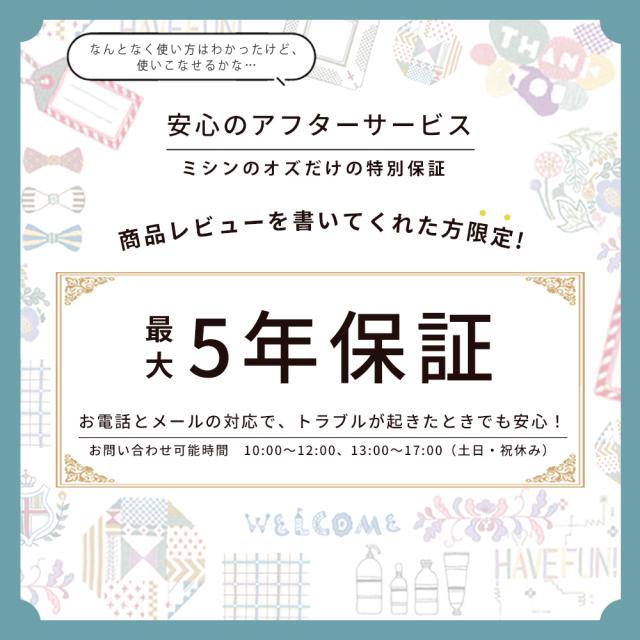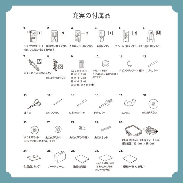 ■標準付属品(付属品バック、糸こま押え(大・中・小・特殊)、ドライバー、ねじ回し、はとめ穴パンチ、ミシンブラシ、糸こまネット、リッパー、はさみ、ボビン4個、ボビンクリップ、刺しゅう枠(M)、刺しゅうシート(M)、ボタン穴かがり押え、たち目かがり押え、片押え、ジグザグ押え、ボタン付け押え、模様縫い押え、まつり縫い押え、刺しゅう押え、電源コード、針セット、刺しゅう機、取扱説明書、カンタン操作ガイド、模様一覧、ハードケース、保証書)
