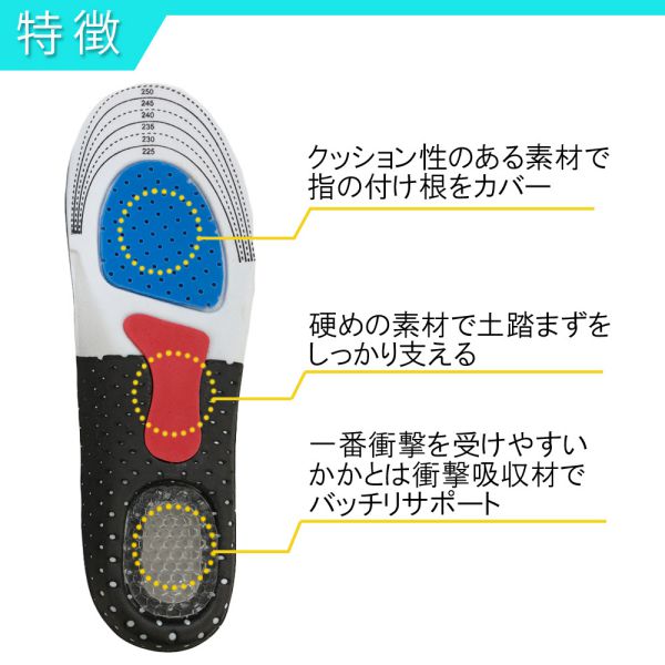 衝撃の強い部分を集中的にカバーし、足の負担を和らげます。
