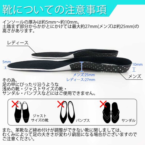 厚みがありますので、浅めの靴・ジャストサイズの靴・サンダル・パンプスなどではご使用できません。