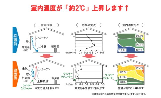 熱ロスを最小限に抑え、室内温度を保ちます。また窓からの冷気をシャットアウトすることで、 部屋全体をムラなく暖め、体感温度を2℃アップします。
