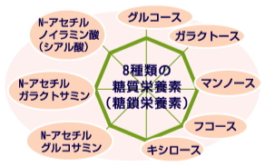 | 8種類の単糖を バランスよく含有 ダイナトーサには単糖抽出した糖鎖栄養素がバランスよく含まれています。 |