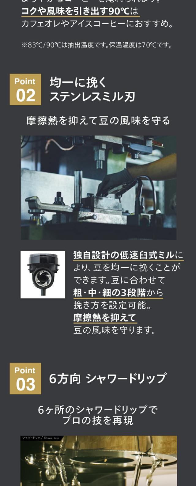 ドリップシャワー噴出口とドリッパーとの間にあえて作った約2cmのすき間は、コーヒーが淹れられる過程を五感で楽しめるようにあえて設けたもの。挽かれた豆が落ちるところから、湯が注がれて膨らむ豆の様子、ドリップの様子などが見えるだけでなく、香り立つコーヒーアロマが部屋中に広がります。