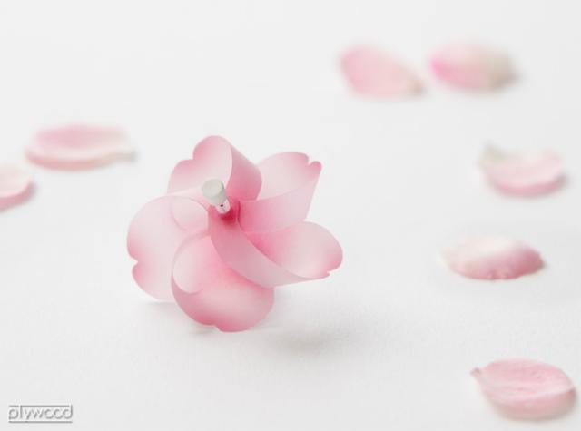 風を受けてくるくるカタカタ回る、小さな風車のようなマグネット「kaze guru ma カゼグルマ」シリーズに季節の花びらモチーフの登場です。5枚の羽の先端を花びらのようにカットし、桜と朝顔のデザインに仕上げました。空気を包み込むような丸みを持たせた形状と花弁から中心部にかけてのグラデーションで、花びらの繊細さ、柔らかさを表現しています。日本の心を表す桜、朝顔の花が軽やかに回る姿は、季節の心地よい風を目で感じることができ、見ている人に癒しを届けます。自然とふーっと息を吹きかけて回したくなりますね。