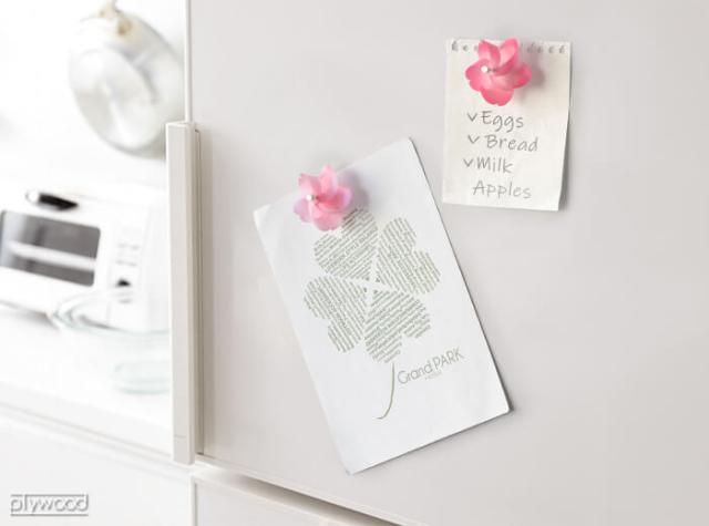 裏側にはマグネットがついているので、写真やカードなどを飾ったり、オブジェ感覚で壁にディスプレイしてもオシャレです。マグネットが付かないお部屋の壁には鉄製の画鋲を刺せばOK。さらに使える場所が広がります。素材は透明感のある合成紙を使用しているのでとても軽量。