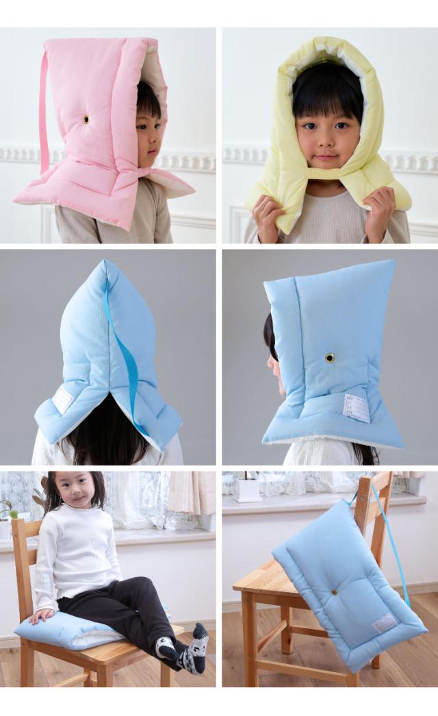 防災頭巾、防災ずきん、避難、地震、火災、難燃、耐熱、衝撃吸収、頭部保護、学校、小学生、幼児、児童用、大人用、日本製、軽量、クッション性、中綿、ポリエステル、難燃繊維、カネカロン、スーパーエクスター、洗濯可能、抗菌、防臭、サイズ調整、あごひも、面ファスナー、ゴム、名前タグ、ネームラベル、収納、座布団兼用、ヘルメット代替、防災訓練、非常時、避難所、備蓄、防災用品、安全対策、校内、保育園、幼稚園、家庭用、企業備蓄、公共施設、落下物、ガラス飛散、煙対策、耐久性