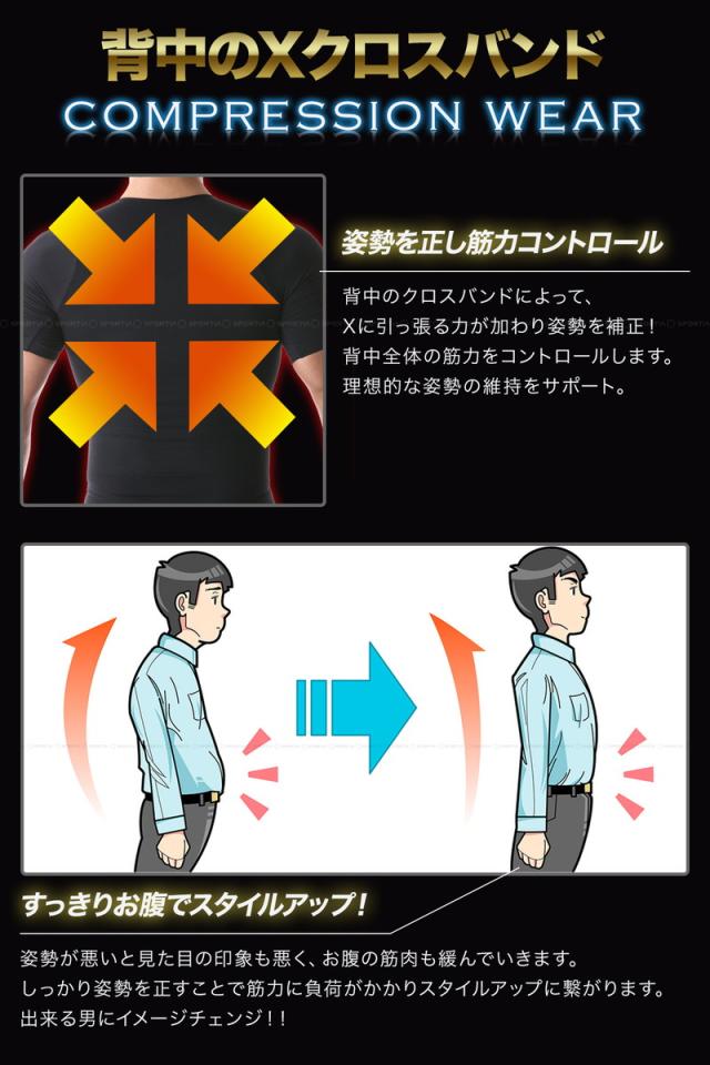 加圧Tシャツの「背中」に設計されたクロスバンドにより正しい姿勢へ、「おなか周り」「脇下」の加圧がウエストを引き締め、正しい姿勢へ導き、スリムなボディラインを作り出す!