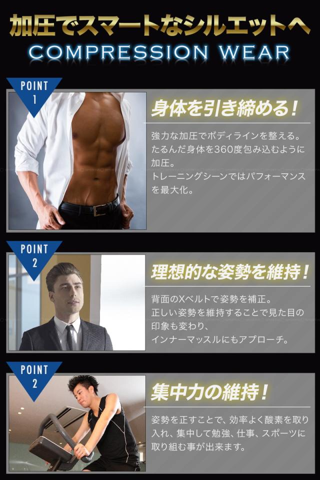 上半身全体を加圧、特に「お腹まわり」「胸部」「背中」を重点的に加圧できるように設計された加圧インナー。