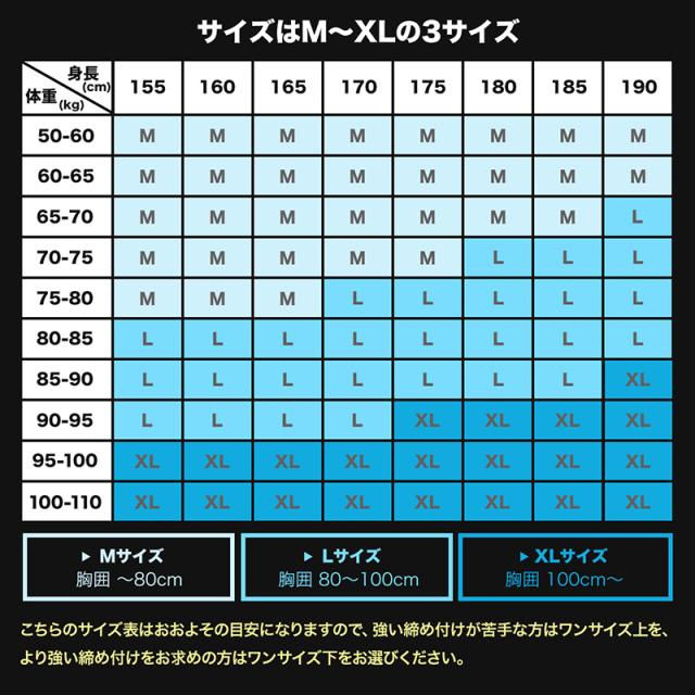 - 160cm 95kgのチビデブ体型でLを注文しました。 サイズ表記を参考に購入、自分にはかなりフィット! 加圧もしっかりキツめで凄く気に入ったので直ぐ2枚目を注文しました。