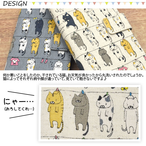 猫好きなら気に入ること間違いなし!!いっぱいの猫達が干されている柄の手帳型ケースです。ちょっとしょんぼりしている感じがして、見ていて飽きないかわいいケースです。衝撃やキズなどからスマートフォンを守るのはもちろん、カメラ、イヤホンや各種ボタンなどを ケースに入れたまま操作可能です。内部はソフトケースなので着脱が簡単!内側にはカードポケットとサイドポケットが付いています。また、ストラップとストラップホール付きです。カラーはベージュとグレーの2色からお選びいただけます。※デザイン、色味は画像と異なる場合がございます。※スマートフォンは付属しません。※ライセンス商品ではありません。
