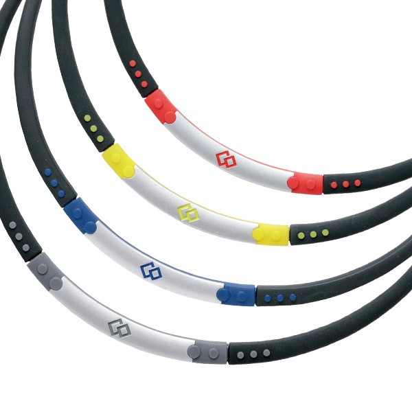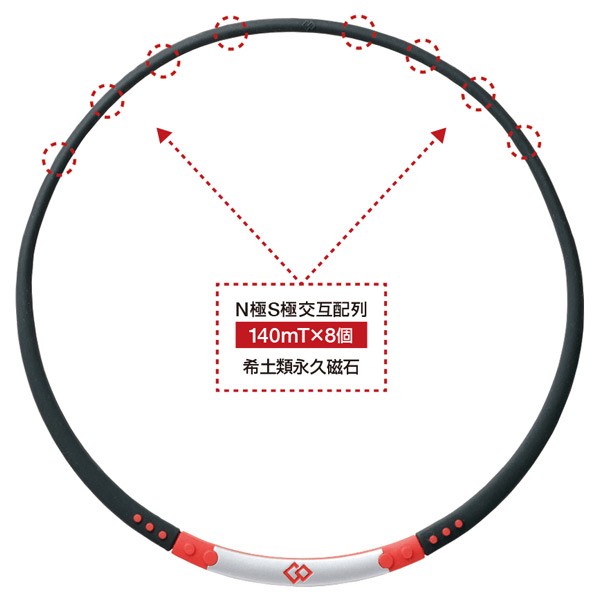 直径4mmのスリムなシリコンループに140mT(1400G)×8個の希土類永久磁石を内蔵したハイスペック仕様。独自のN極S極交互配列で磁力が広範囲に影響し、首・肩の血行を改善、筋肉のコリを緩和します。