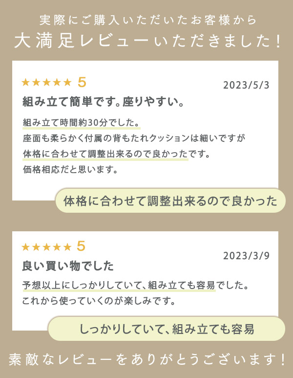 - 今まで使用していた物が壊れてしまい、購入しました。 到着も早く、作りもしっかりしています。 それほど時間かからずに組み立てれたようです。 座り心地も良いらしく、お値段もお手頃なので満足です。
