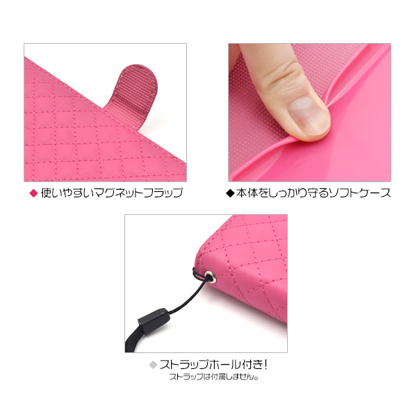 触り心地抜群のキルティングレザーを使用したオシャレな手帳型ケースです。衝撃やキズなどからスマートフォンを守ります。また、内部はソフトケースなので着脱が簡単です。 背面を折り返すとスタンドとして使用できるので、動画視聴に便利です。 落下防止に便利なストラップホール付きです。また、内側にカードポケットとサイドポケットが付いています。※スマートフォンは付属しません。※ライセンス商品ではありません。※カードは付属しません。※ケースをつけたまま撮影できますが、フラッシュ撮影時にケースの色が移り込むことがあります。