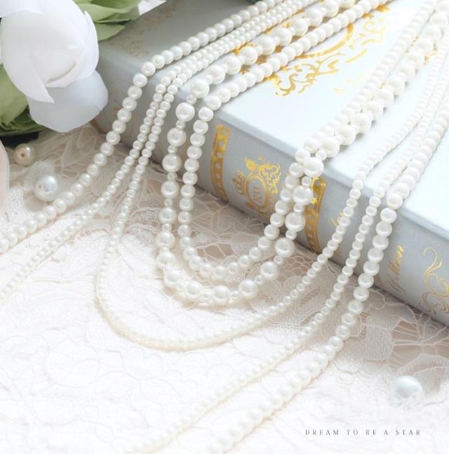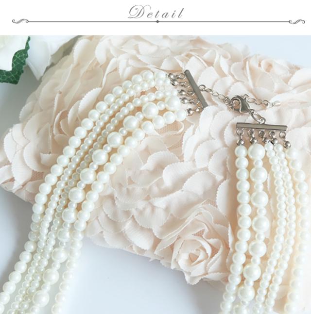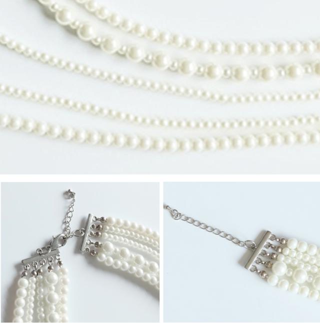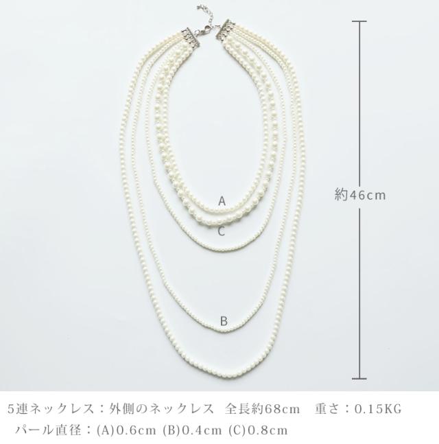 異なるサイズのハーモニーが楽しめる嬉しい5連フェイクパールネックレスです。