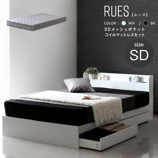 ベッド 棚付き 引出付 マットレス付き RUES【ルース】 送料無料 シンプルフォルムの多機能ベッド セミダブルサイズ ポケットコイルマットレス付