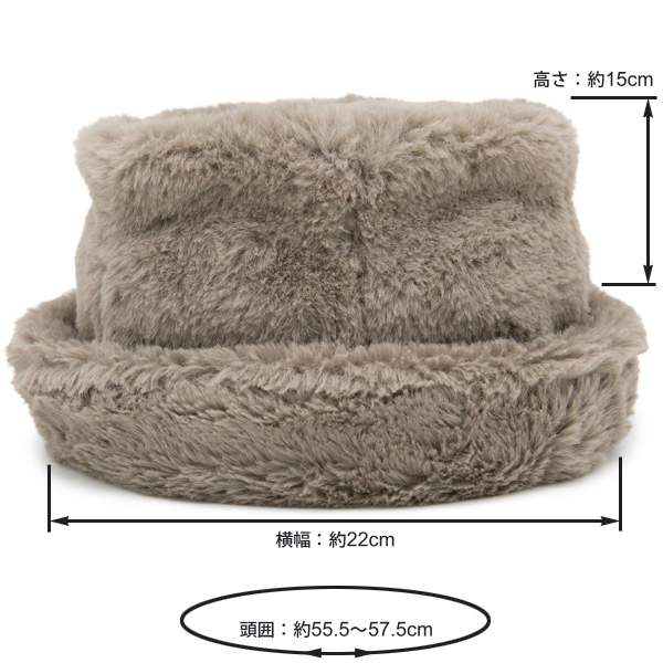 | サイズ | サイズ表記57.5cm(頭囲:約55.5〜57.5cm[紐でサイズ調整可能]、高さ:約15cm、横幅:約22cm、折返し部分:約6cm) |