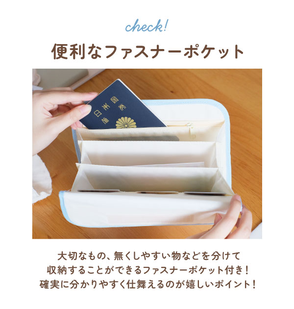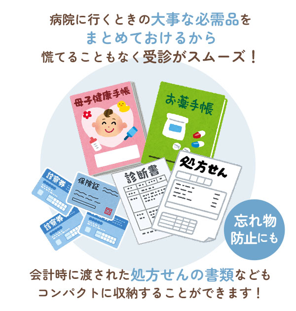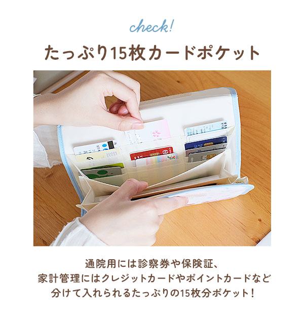 | 商品説明 | 保険証や母子手帳、診察券もこんなケースにまとめておけば、おでかけの時にさっと持ち出せて便利です。ジャバラ式だから何が入っているか見えやすく、ワンタッチテープで開け閉めしやすい。ファスナーポケットやカード入れも充実しているから、母子手帳ケースとしてだけでなく、通帳ケースとしてOLさんにもオススメです。 |