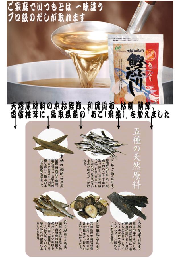 ご家庭で、手軽に取れる料亭の味!天然原材料の本枯鰹節、利尻昆布、枯割 鯖節、香信椎茸に、鳥取県産の「あご(飛魚)」を加え、使いやすい小袋にギュッと 詰めました。ご家庭でいつもとは 一味違うプロ級のだしが取れます。