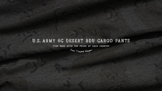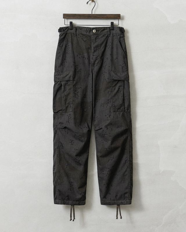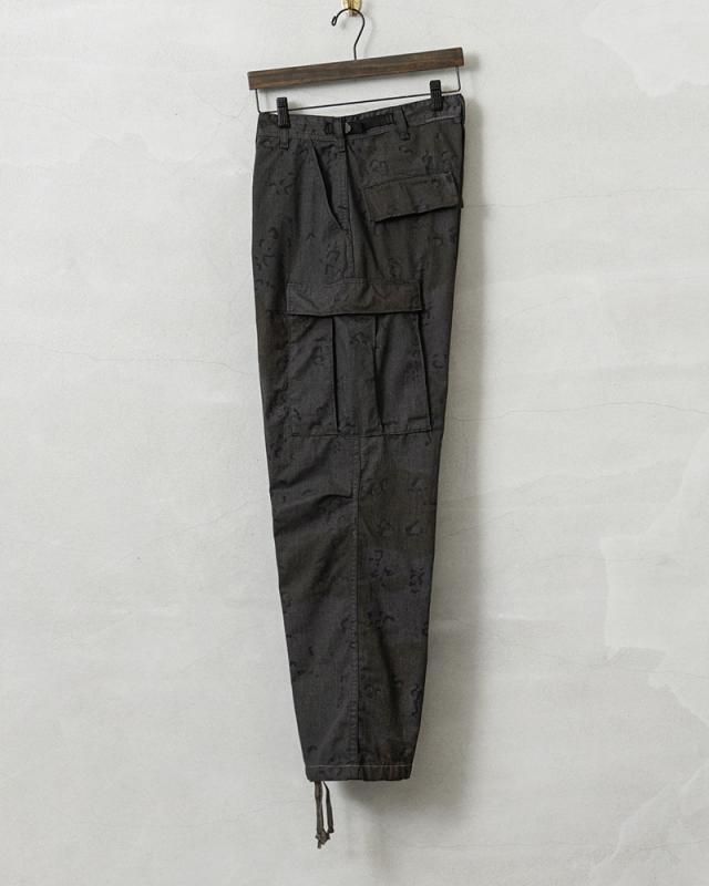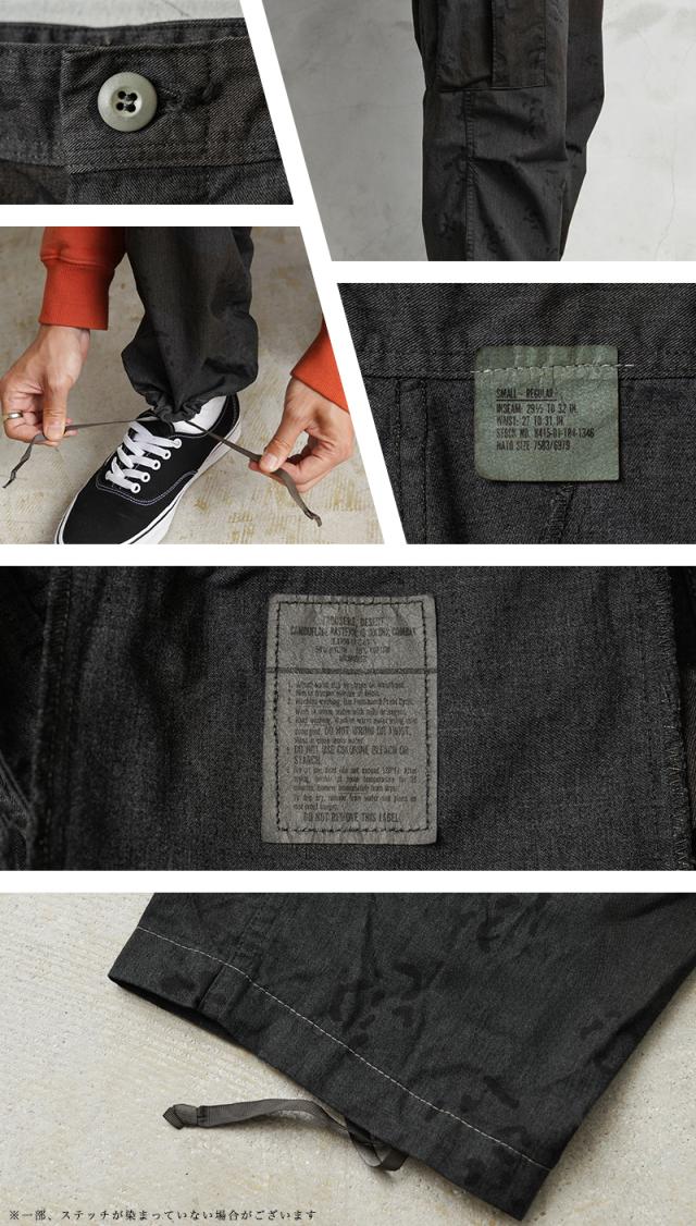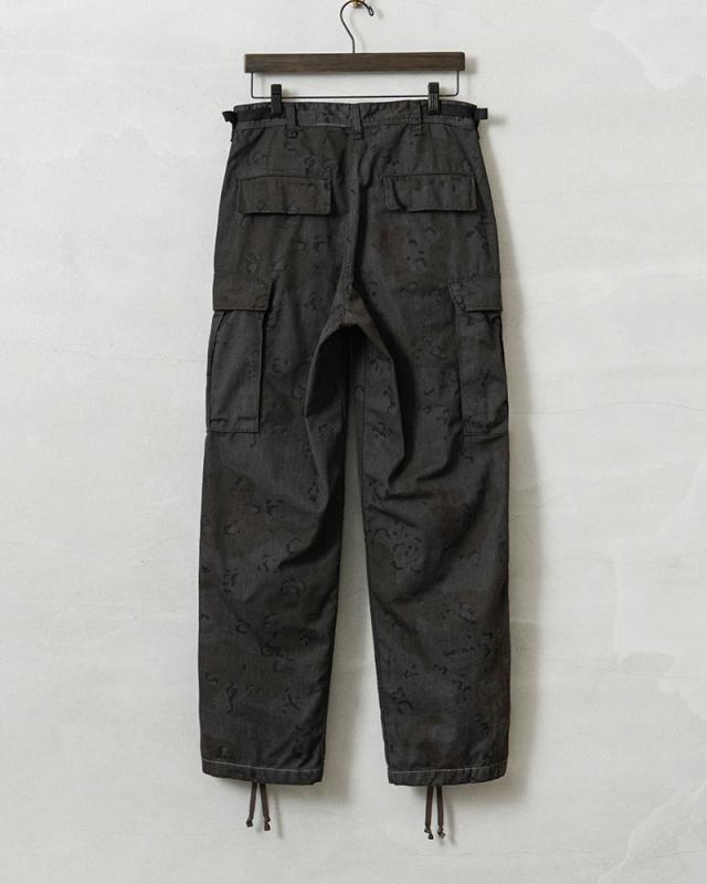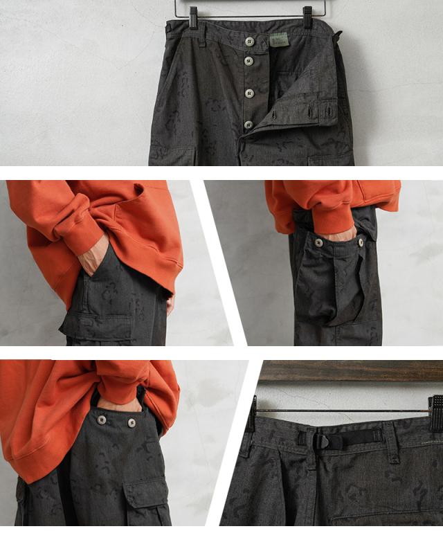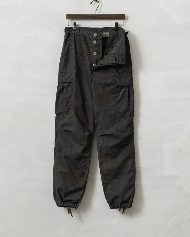 米軍実物放出品の湾岸戦時に使用された通称「チョコチップ」又は「6カラーデザートカモ」と呼ばれる米軍において初めて採用された砂漠用のデザート迷彩柄です。正確にはDBDU(Desert Battle Dress Uniform)というカモフラージュパターンのレアアイテムが未使用デッドストックでの入荷です!そのBDUパンツを染め職人に丁寧にBLACK染めしていただきました。迷彩柄を残すように製品染めを施すことで、うっすら浮き出ている迷彩が雰囲気抜群な仕上がりです。素材にはコットン、ナイロン混紡のツイル素材が使用されています。フロントはボタンフライ仕様で、ウエスト両サイドのアジャスターで細かい調整が可能です。