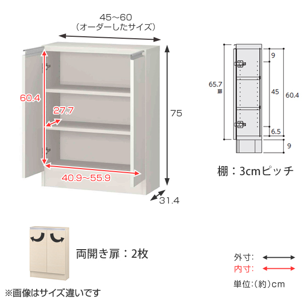 カウンター下収納 幅オーダー 扉付 レギュラータイプ 高さ75cm 幅45〜60cm ( 収納 キッチン収納 キャビネット 窓下収納 リビングボード 収納棚 食器棚 収納家具 可動棚 開き戸 セミオーダー 日本製 )