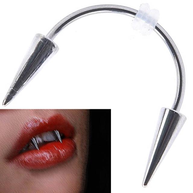 ハロウイーンパーティーのバンパイアのコスプレ仮装にもオススメ!シャフトには透明のシリコンラバーのゴムキャッチが2個付けちゃいました!(これは正規品にはないサービスですww)さりげなく見えるキバがかっこいいボディピアッシング。 両側ともネジ式のキャッチなので、別売りのパーツやキャッチに付け替えてオリジナルの牙を作ってもオモシロイ。口のピアスにするだけでなく、もちろん耳や軟骨、アンテナヘリックスに鬼の角のようにしてもおしゃれ!