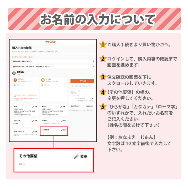 - 名前を入力するのを忘れて注文してしまい、すぐにお店にメールして対応して頂きました。 ありがとうございます。