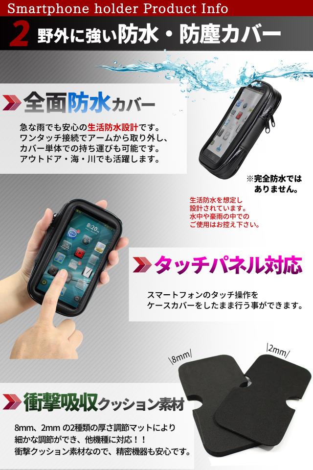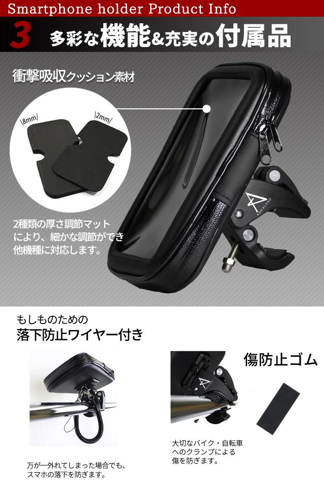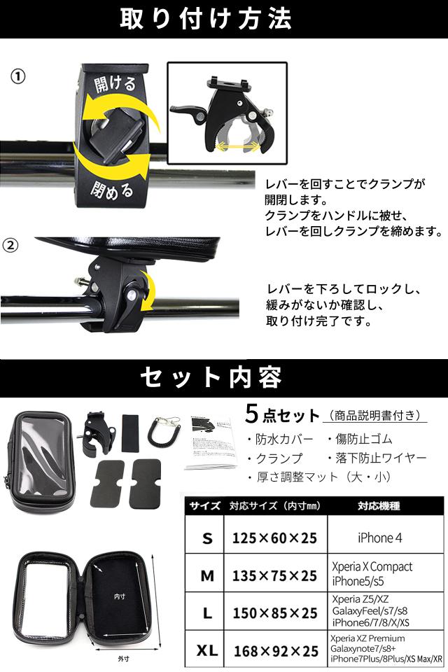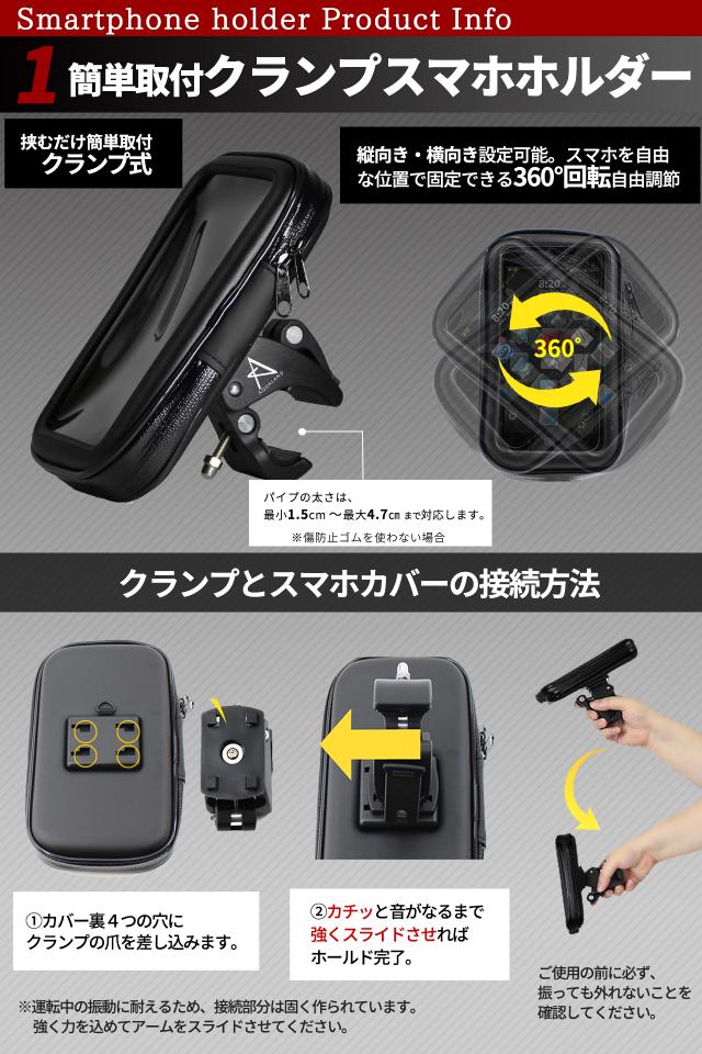 自転車やバイクなどに使えるスマホカバー&クランプです。スマホやナビを簡単に取り付けることができます。カバー、クランプに加えて傷防止ゴム、落下防止ワイヤーのお得な4点です。耐震・防塵・防水に優れ、砂ホコリや振動、急な雨にも強いマウントタイプです。取り付けが簡単なクランプタイプです。好きな位置に取り付けることができます。
