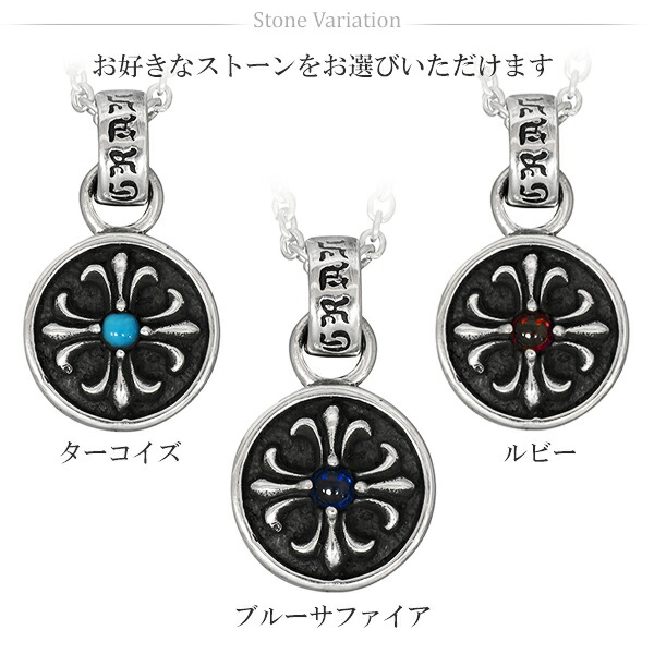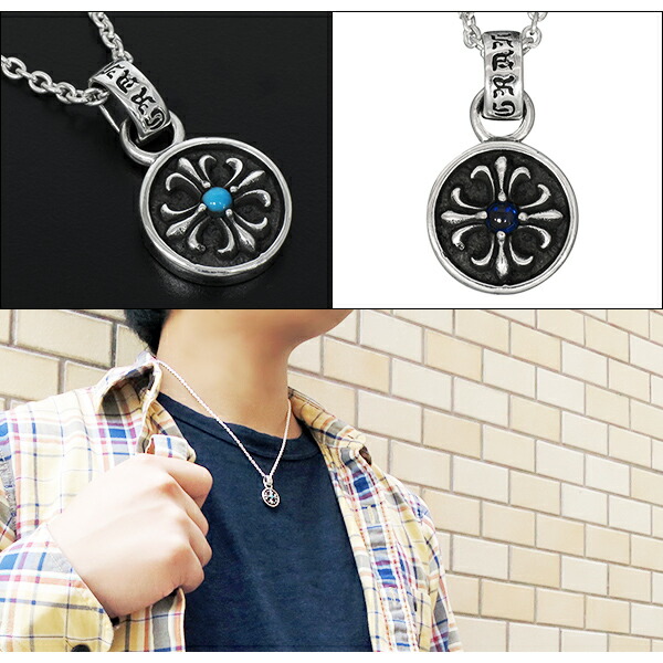 円形のフレームにフレアクロスの紋章があしらわれたネックレス。