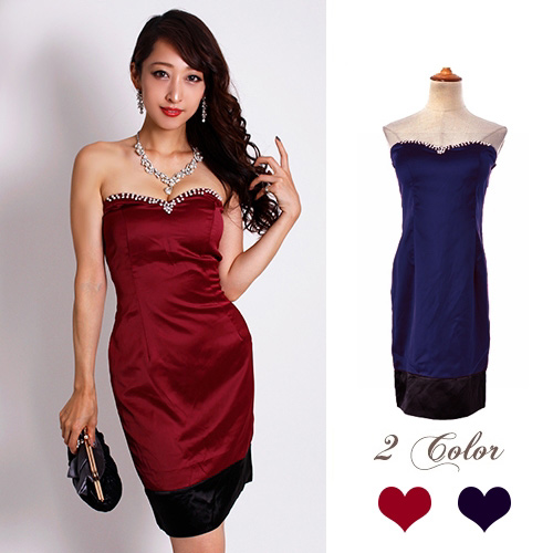 高級感サテン素材のバイカラー、ミニドレスの登場です♪♪ パールとクリスタルストーンで2連に縁取りしたハートカットの胸元がSEXYな視線を誘います♪ ボディラインを見せつけるタイトなシルエットがSEXYな女性らしさをアピールしてくれます♪ ♪(^_-)!