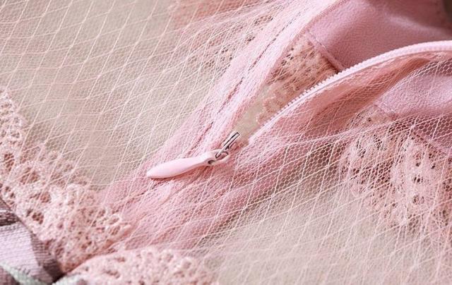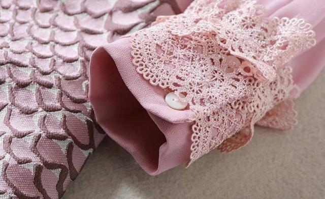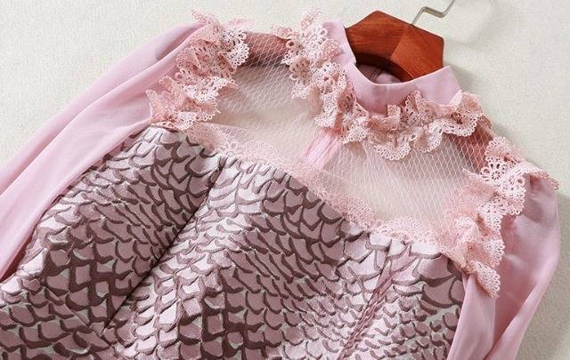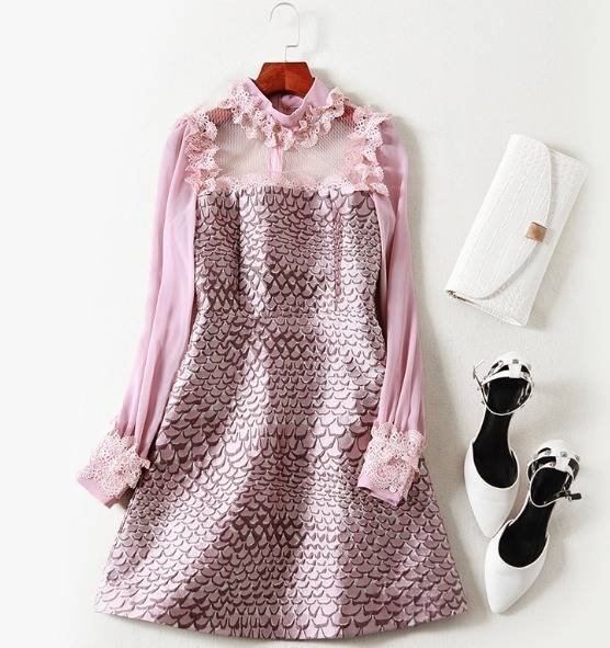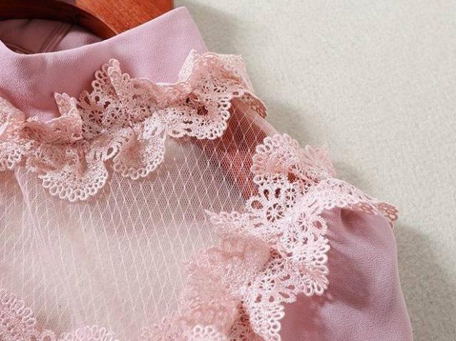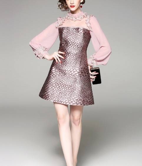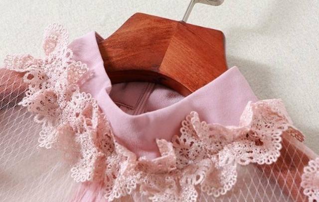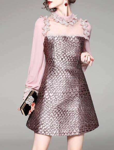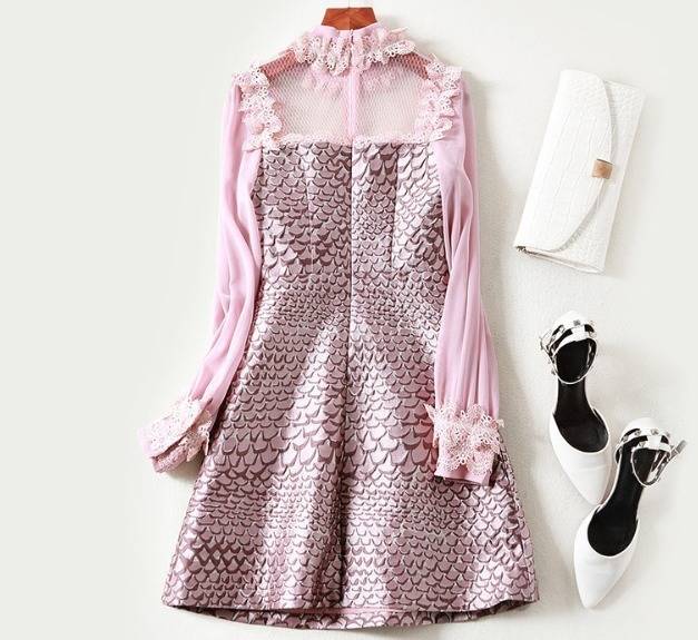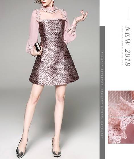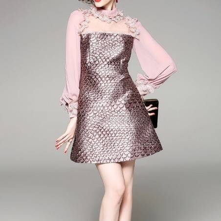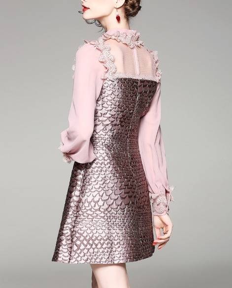 パーティーワンピース レース メッシュ 長袖 フリル ミニ丈 Aライン ドレス フレア 異素材ミックス ピンク キュート 大人可愛い 二次会