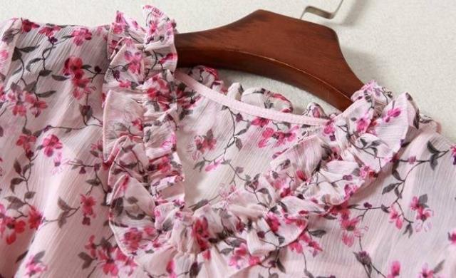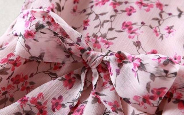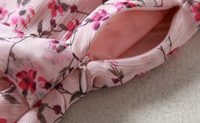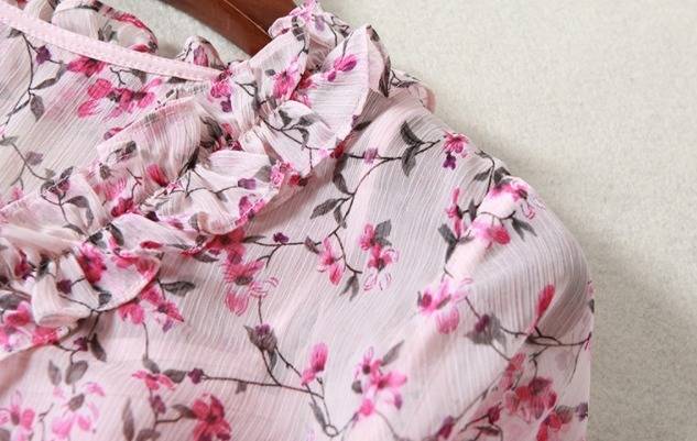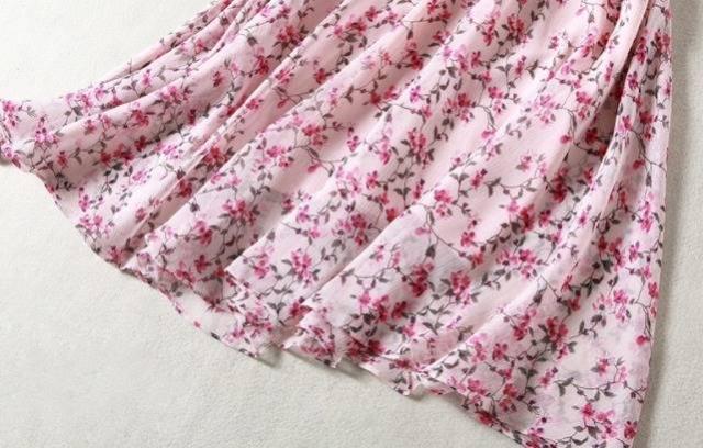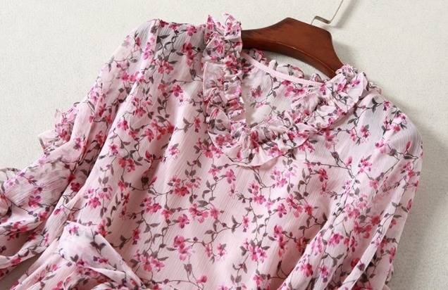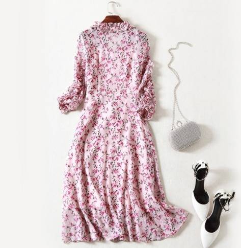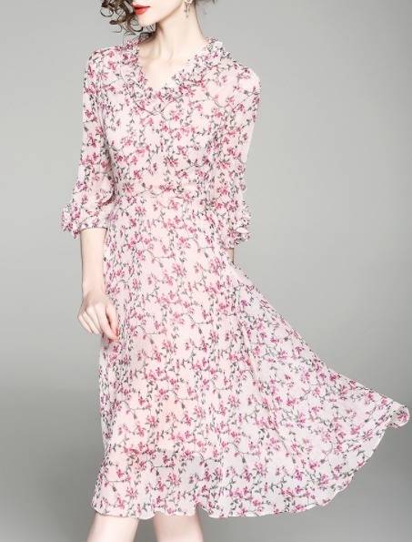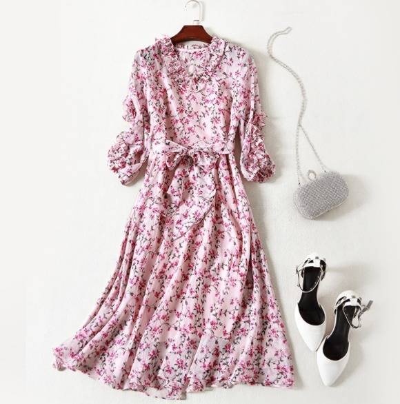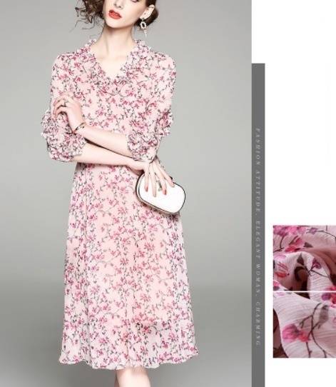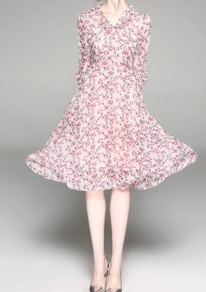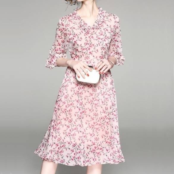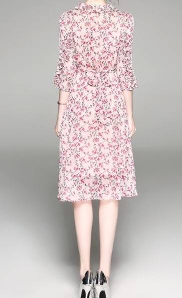 パーティーワンピース 花柄 フリル?ネック リボンベルト 七分袖 膝丈 Aライン ドレス フレア ピンク 大人可愛い フェミニン