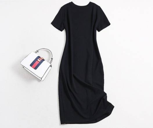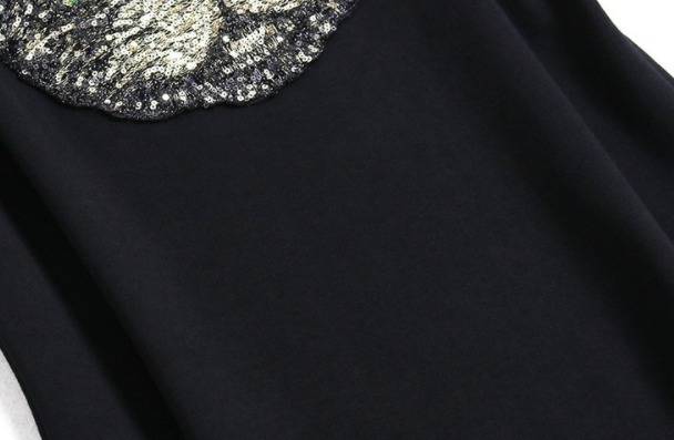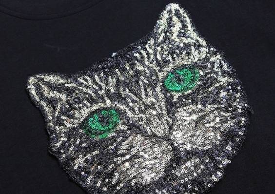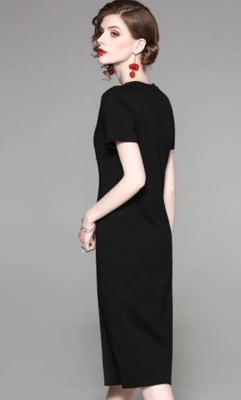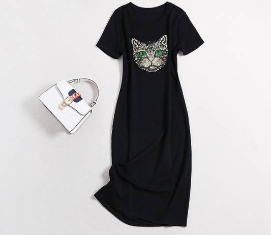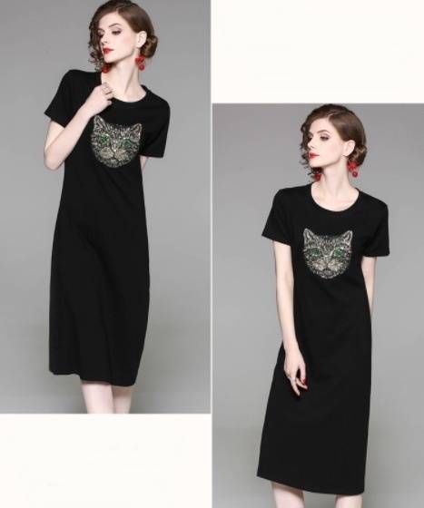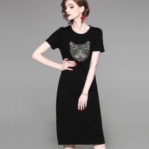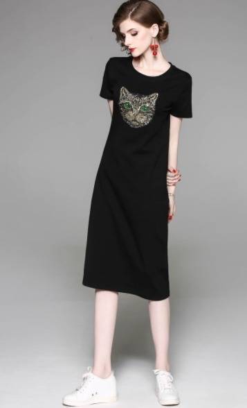 ネコビジューワンピース クルーネック 半袖 黒 猫 膝下丈 ミディ丈 おしゃれ エレガント お出かけ 女子会 食事会 お呼ばれ