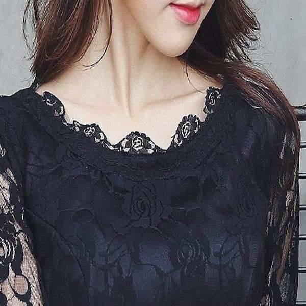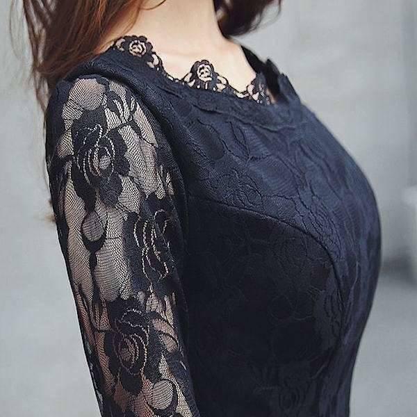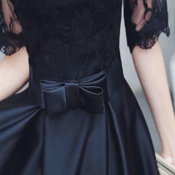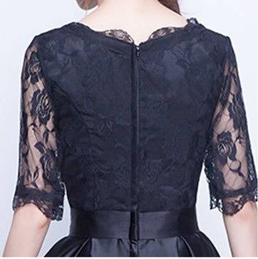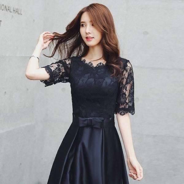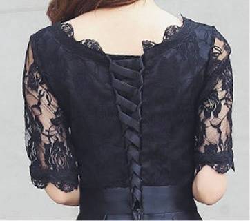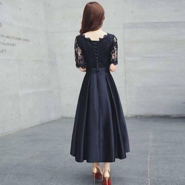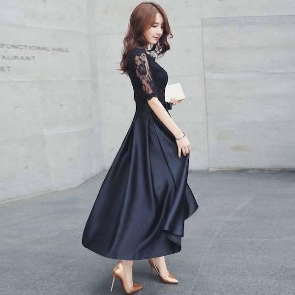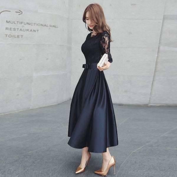 パーティードレス レース サテンスカート ロング ハイネック スカラップ フレア Aライン ウエストリボン レースアップ ファスナー