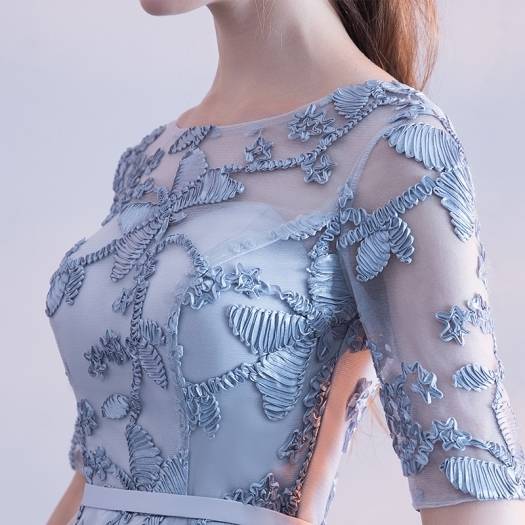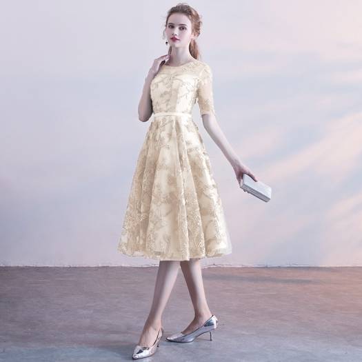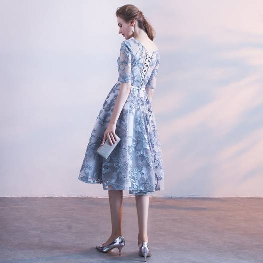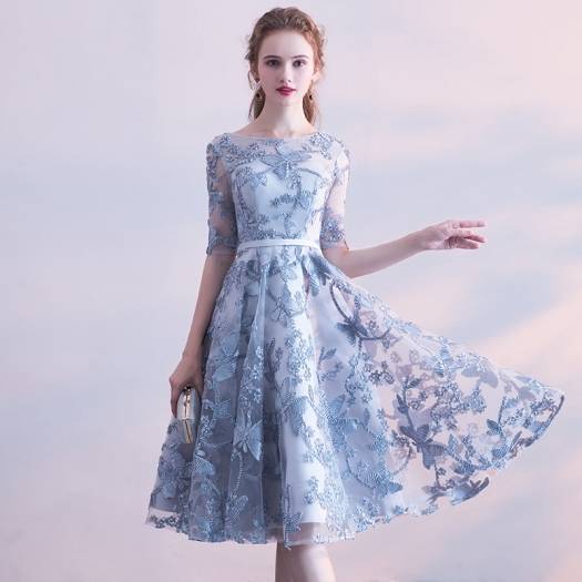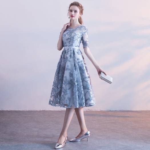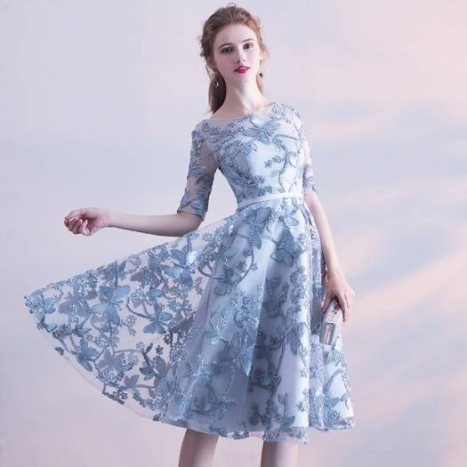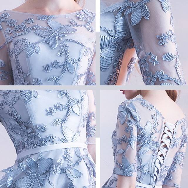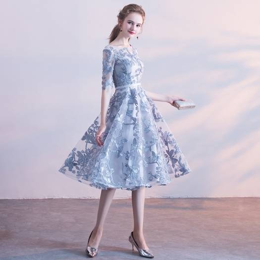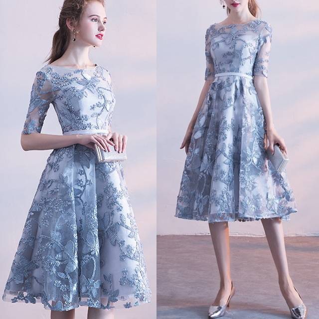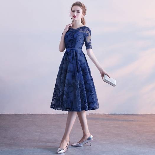 パーティードレス マリアージュドレス 春夏 結婚式 二次会 披露宴 ネイビー 大きいサイズ ひざ丈 ひざ下丈 五分袖 半袖 袖あり Aライン Xライン フレア 刺繍 レース 花柄 透け感 シースルー ラウンドネック 20代 30代 フォーマル フェミニン ガーリー