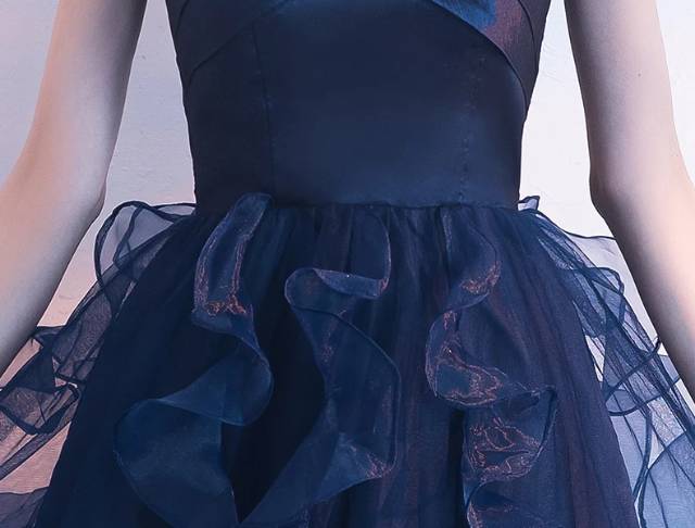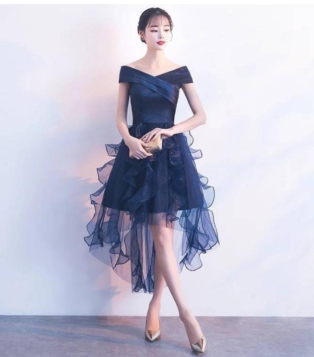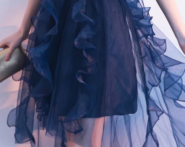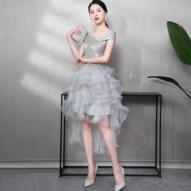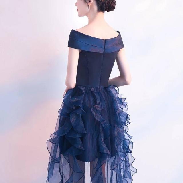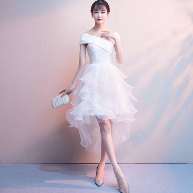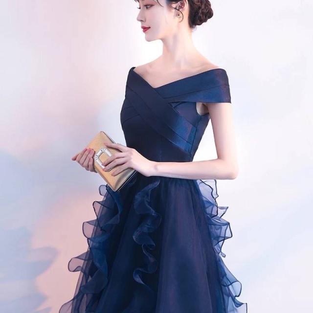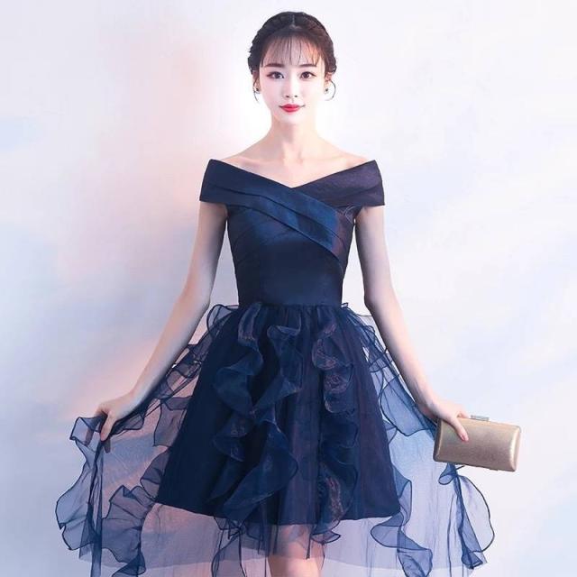 パーティードレス 無地 オフショルダー Vネック フィッシュテール ミニ丈 フレア フリル チュール 透け感 Uネック リボン フェミニン