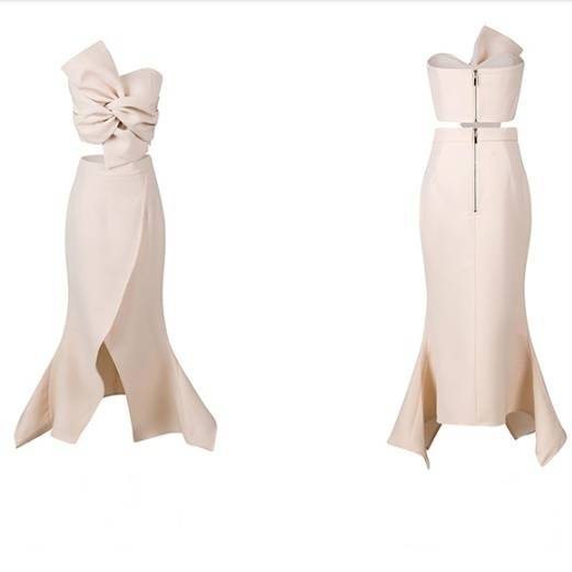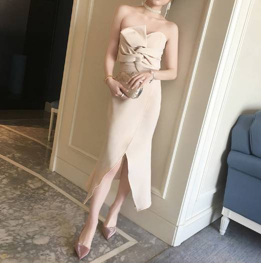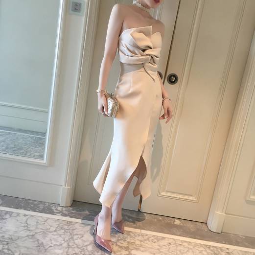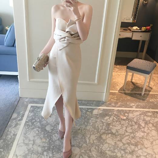 パーティードレス ベアトップ タイト ミディアム ミモレ丈 ロング ラップスカート スリット リボン風 セクシー フェミニン エレガント